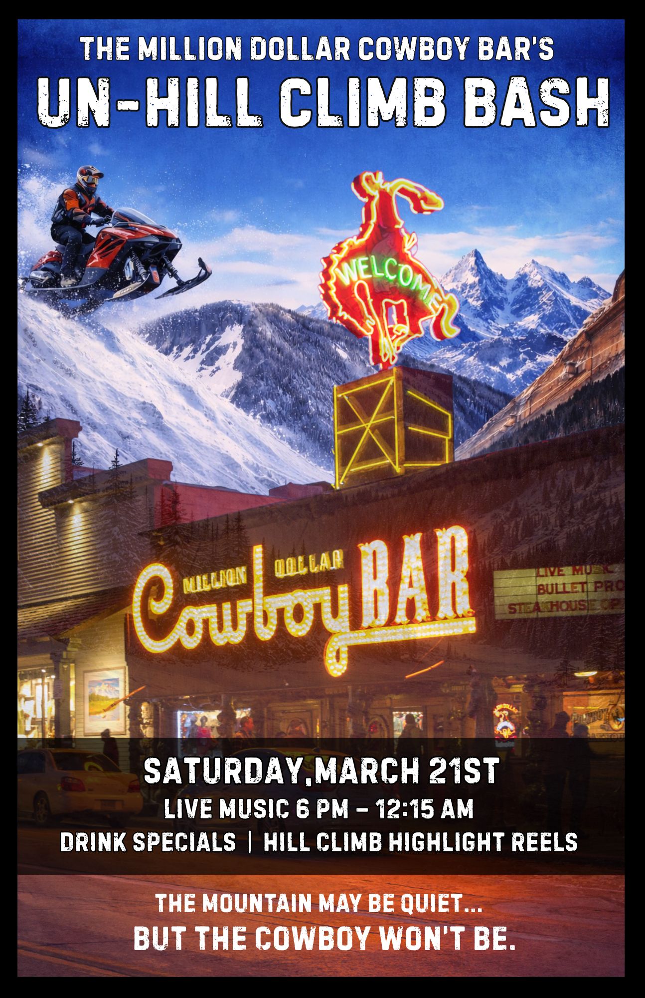 The mountain may be quiet, but the Cowboy won’t be. Join the Un-Hillclimb Bash with drink specials all day, early live music sets starting at 6 PM, and highlight reels from last year’s hill climb weekend. Come keep the tradition alive with a night of music, drinks, and dancing.