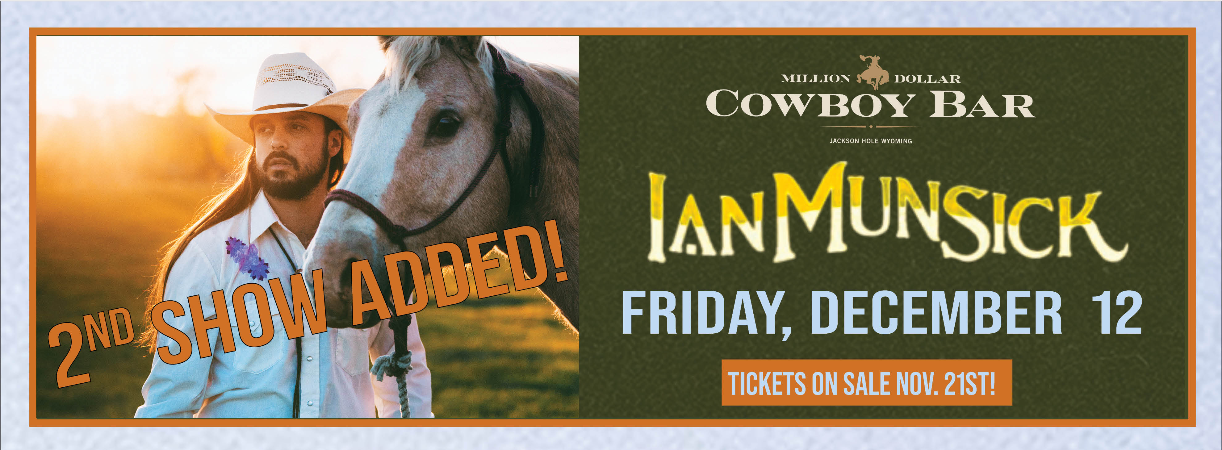 Not only has Ian Munsick sold-out shows in Jackson’s Million Dollar Cowboy Bar three years in a row, but because of the demand for tickets for his previously announced December 11th show, a second night has been added. The Wyoming native will also bring his high-energy duo to the iconic stage on Friday, December 12th.